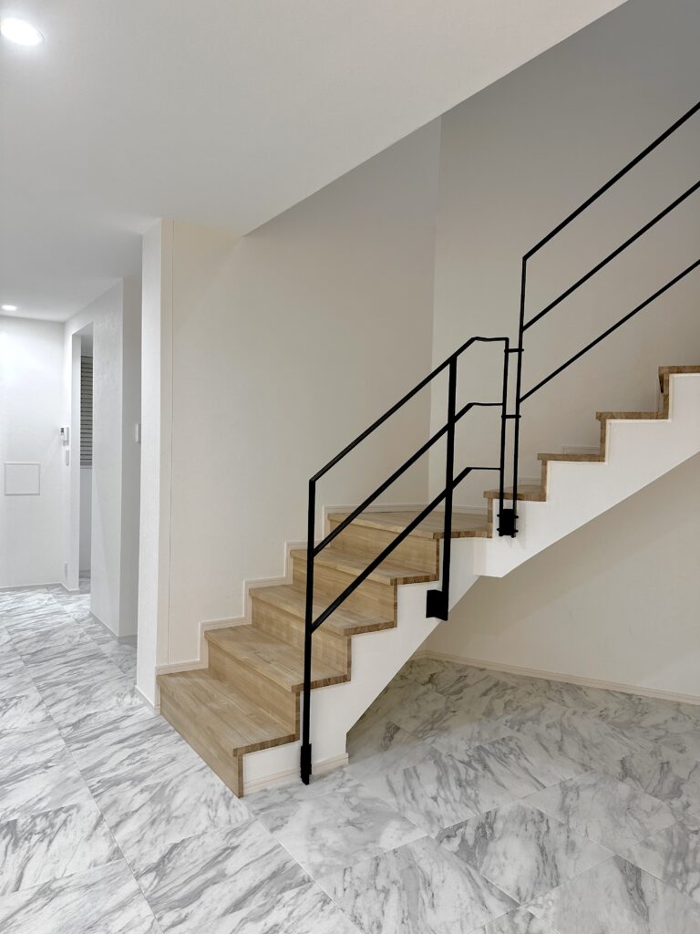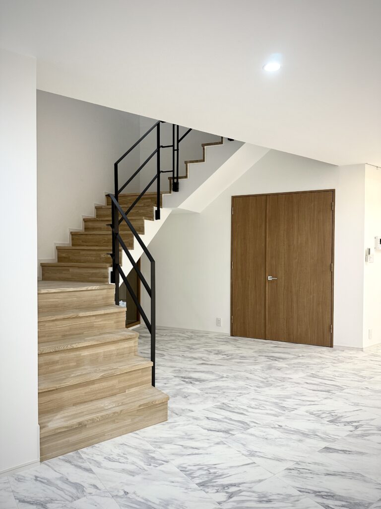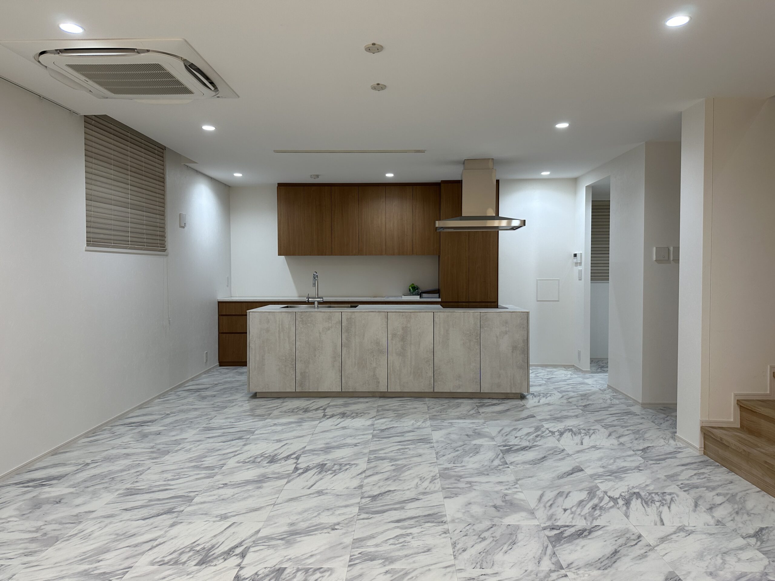 温かみののあるフローリングの空間から一変、明るい大理石の高級感のある空間へ。